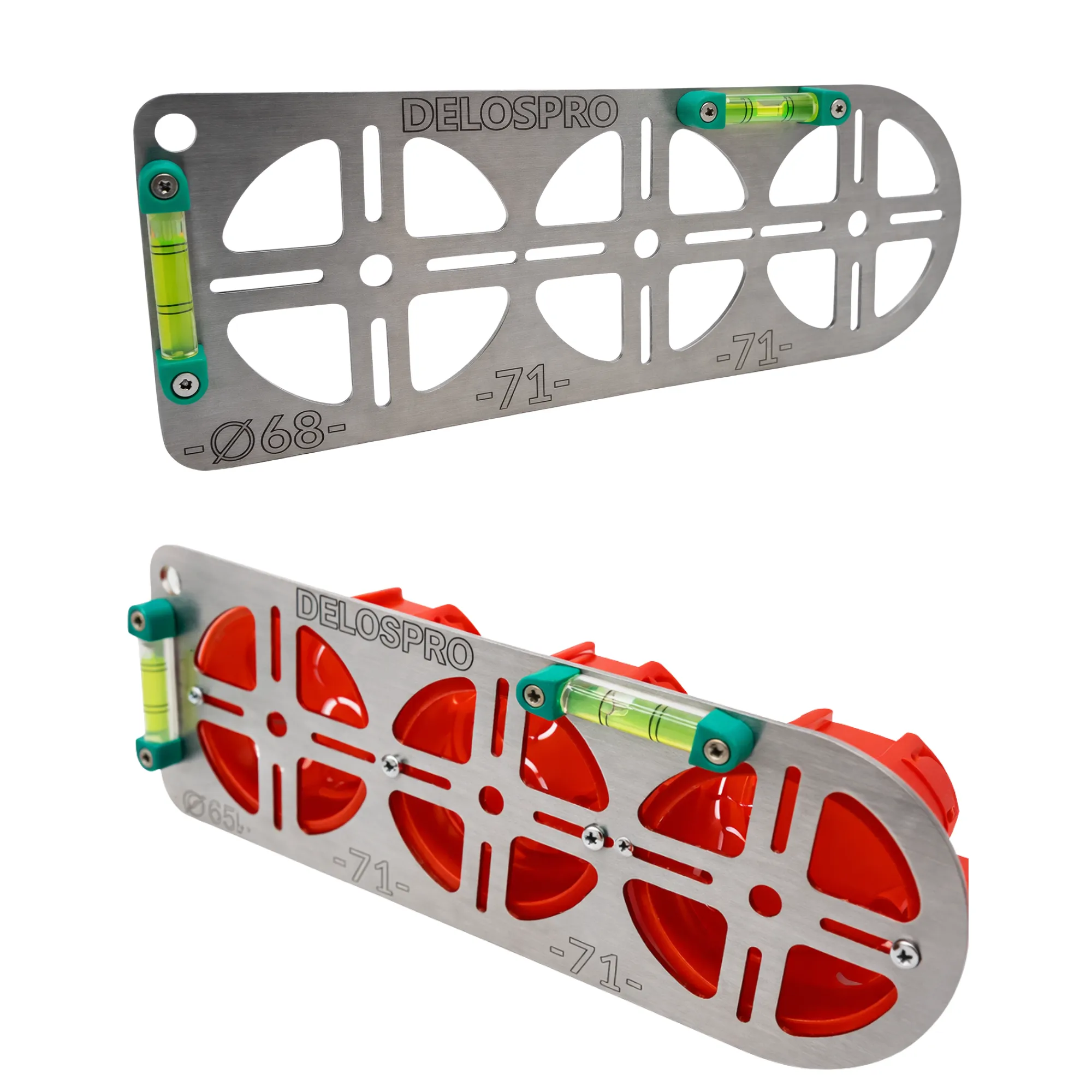 Nierdzewny szablon do wymiarowania 4 puszek elektrycznych 68 mm – rozstaw 71 mm