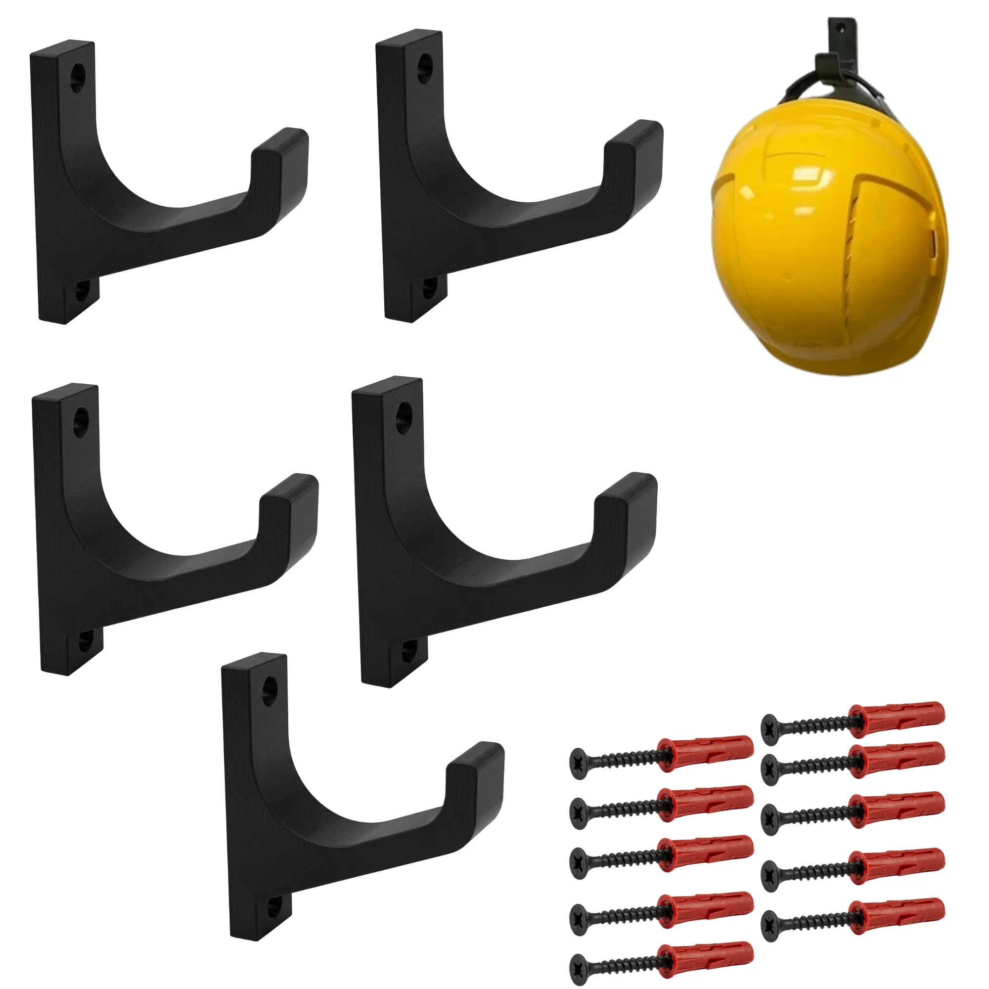 Ten zestaw zawiera 5 czarnych uchwytów do przechowywania kasków. Dzięki temu można zamontować haki obok siebie i przygotować praktyczny system przechowywania dla całej brygady, zespołu montażowego lub pracowników magazynu. Takie rozwiązanie dobrze sprawdza się wszędzie tam, gdzie używane są kaski budowlane, hełmy ochronne oraz standardowe kaski robocze.