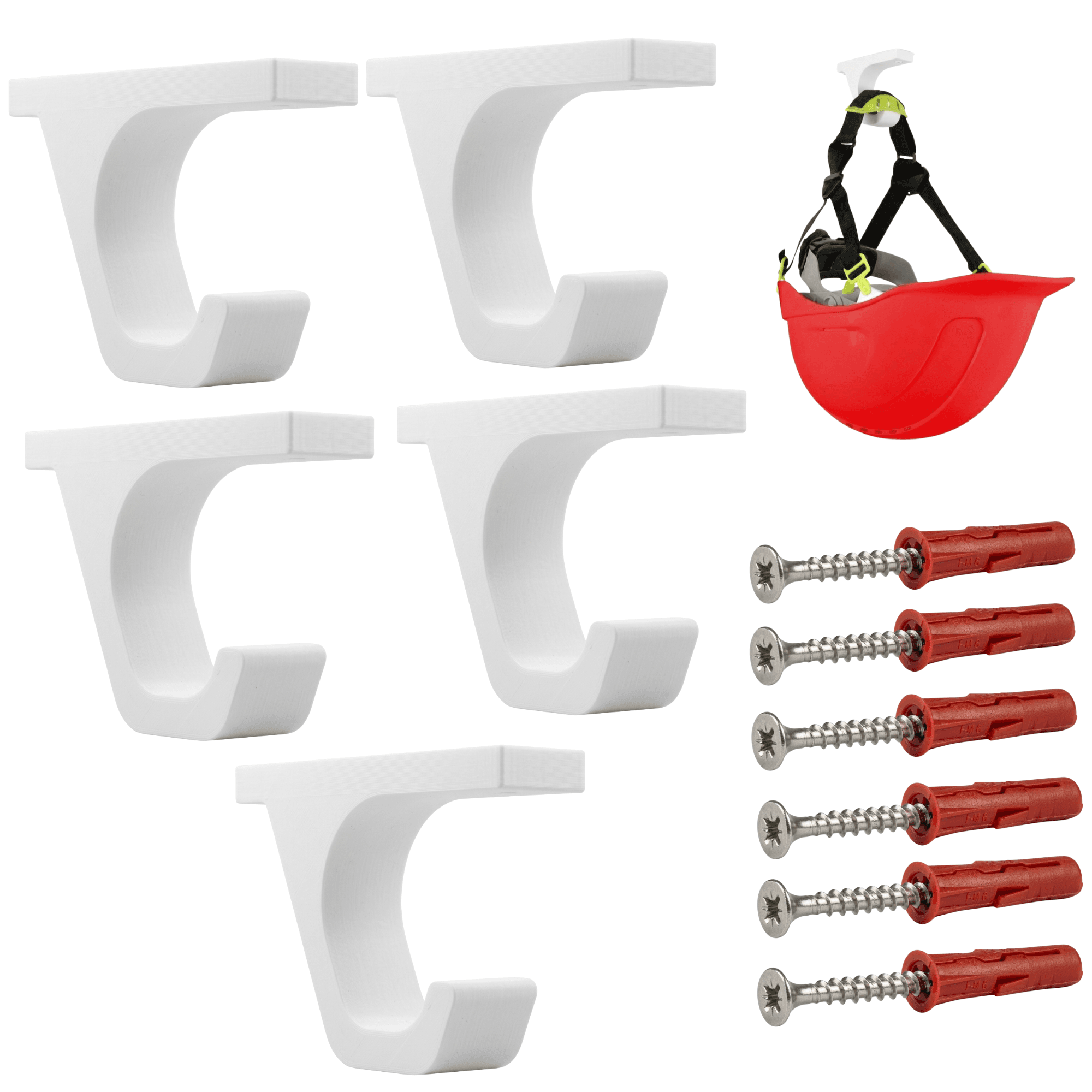 Ten zestaw zawiera 5 białych uchwytów na kaski BHP, które można zamontować obok siebie na ścianie. Dzięki temu możliwe jest stworzenie miejsca do przechowywania kasków budowlanych dla całej brygady lub zespołu pracowników.