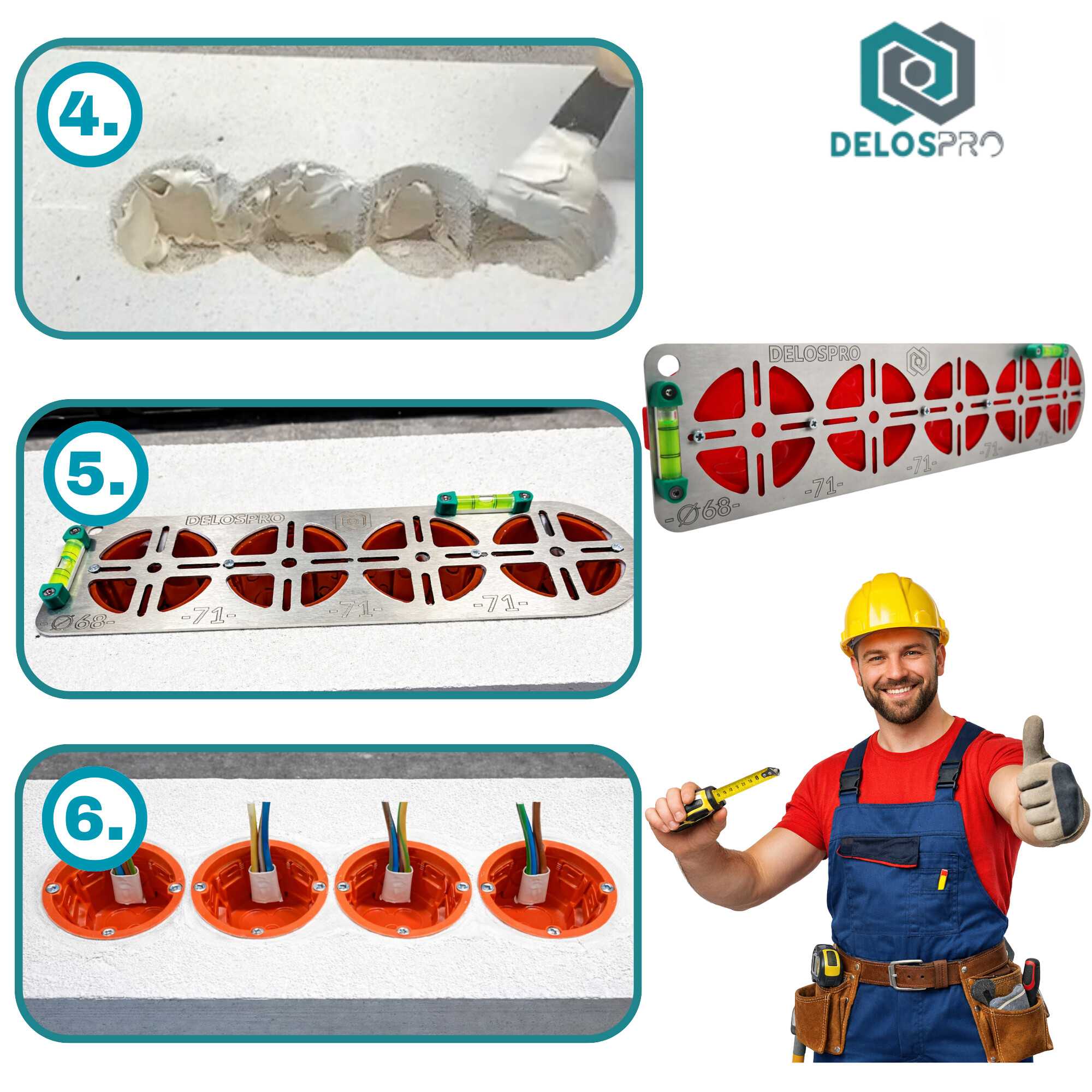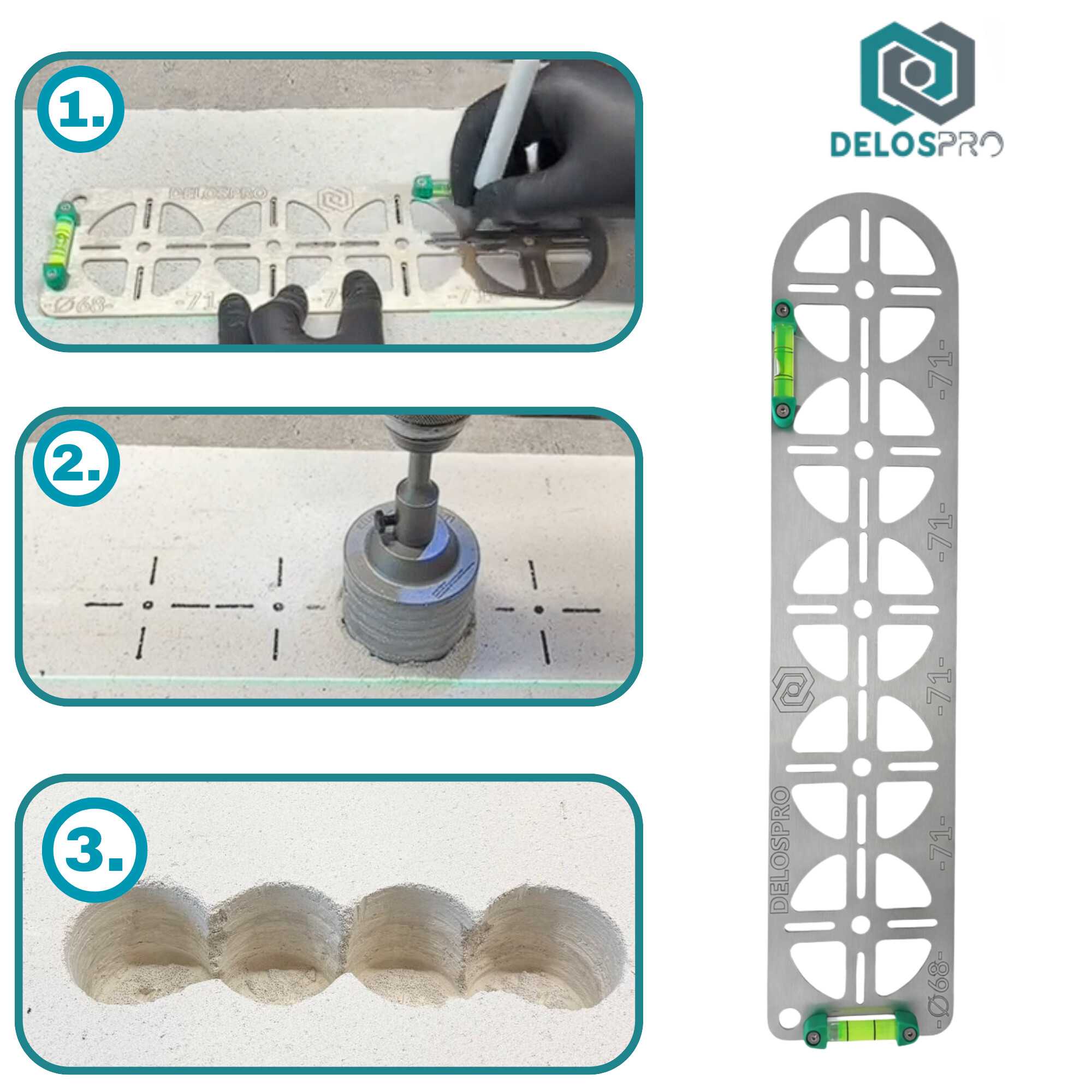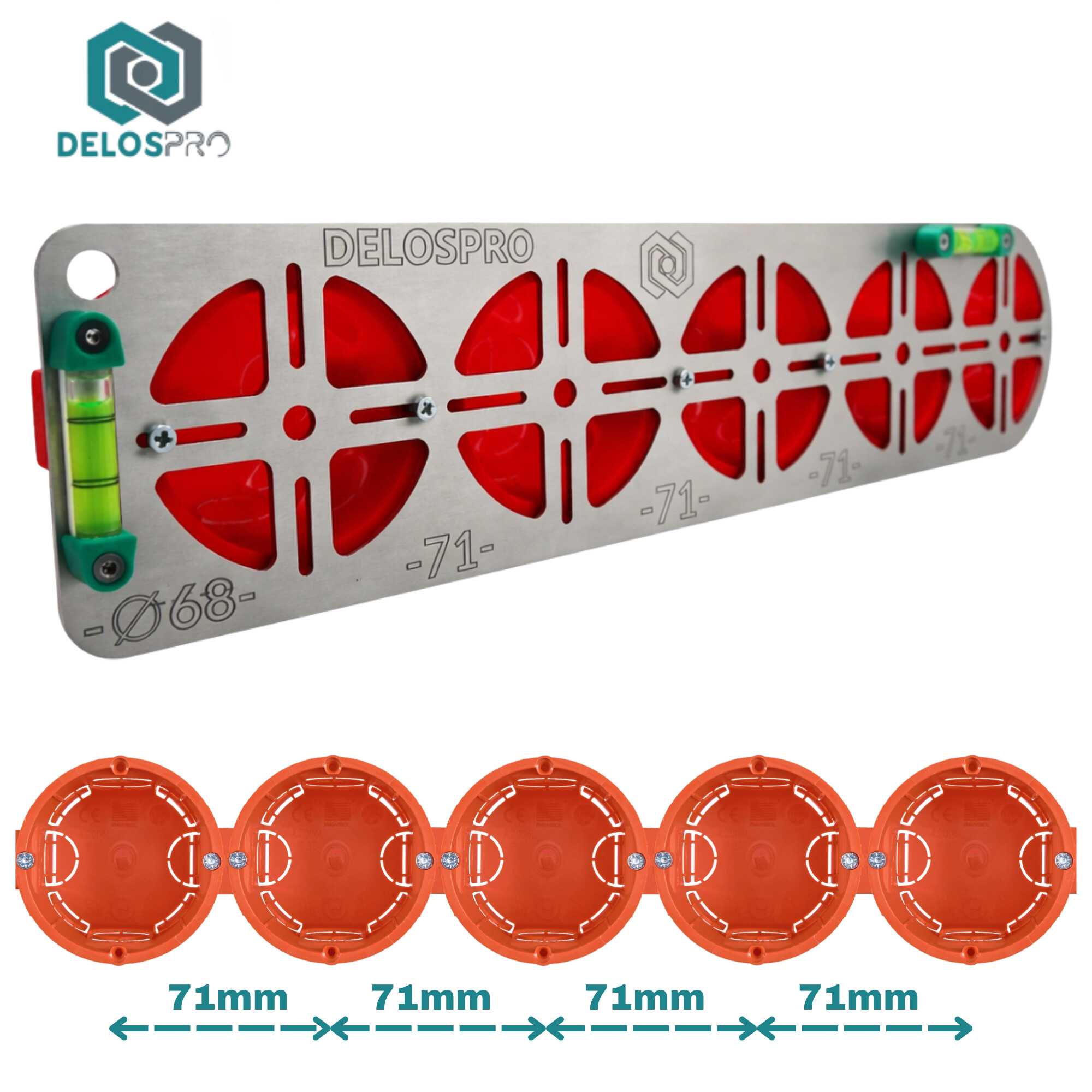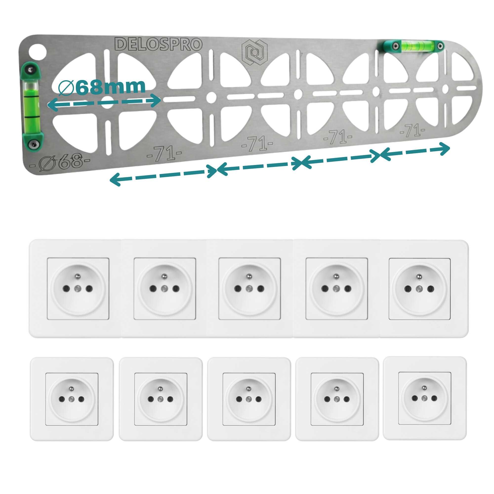 Ten wariant ma pięć stanowisk pod otwory Ø68mm oraz stały rozstaw osi 71 mm, który odpowiada typowemu standardowi puszek podtynkowych. Dzięki temu możesz wyznaczyć ciąg pięciu puszek w jednej linii bez ręcznego odmierzania każdego punktu osobno. To rozwiązanie szczególnie przydatne w mieszkaniówce i przy pracach seryjnych, gdzie liczy się tempo oraz identyczna geometria w całym obiekcie.