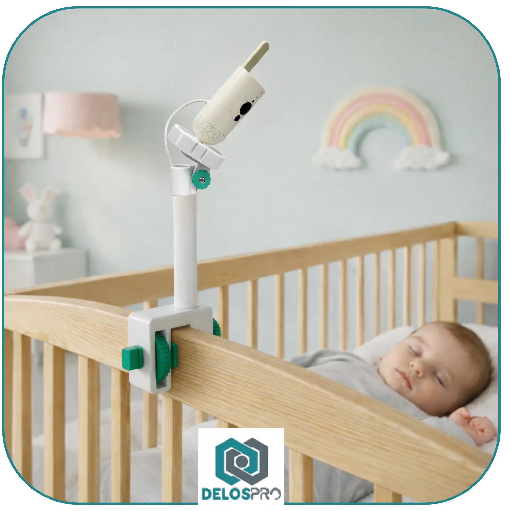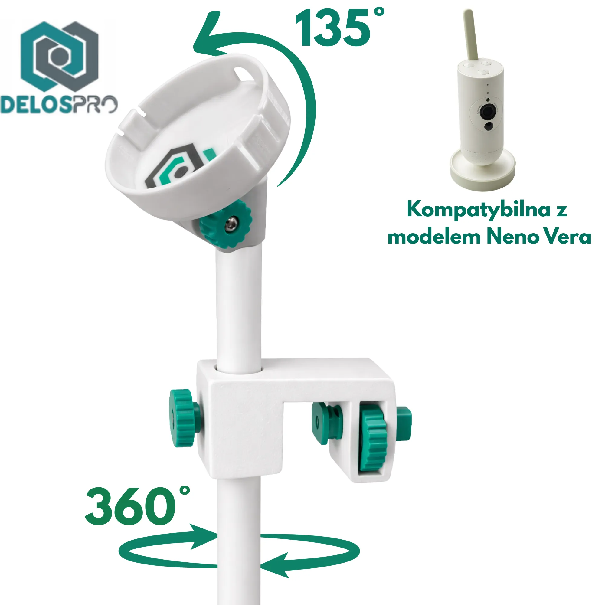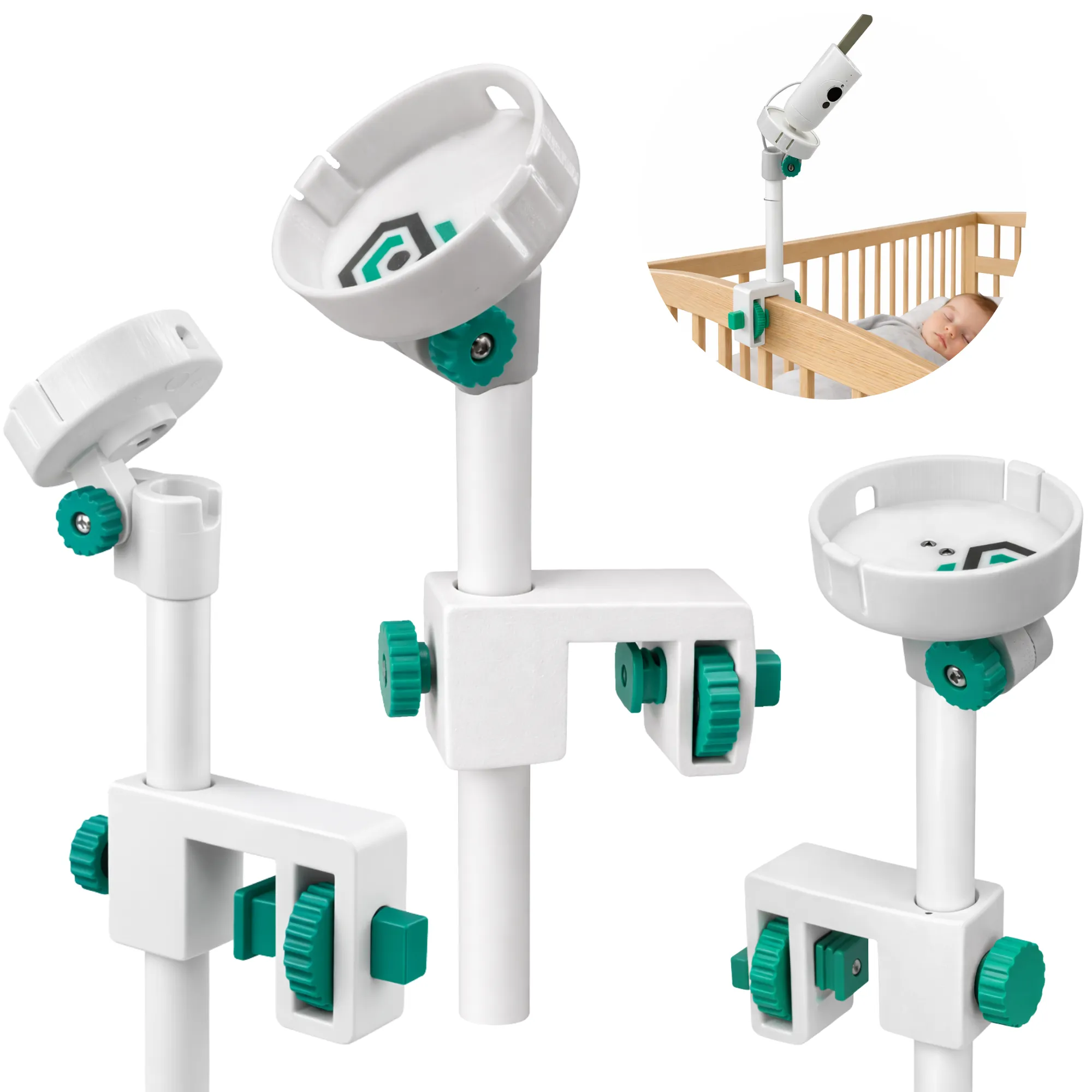 Dzięki regulowanej konstrukcji uchwyt pozwala ustawić kamerę dokładnie nad łóżeczkiem, zapewniając pełny widok na dziecko podczas snu i codziennej aktywności. To wygodna alternatywa dla ustawiania kamery na komodzie lub półce, gdzie łatwo o przesunięcie lub ograniczone pole widzenia.